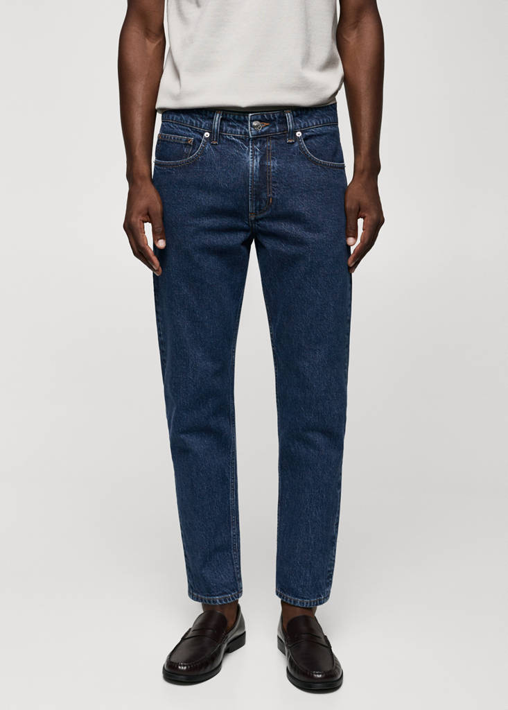 ESSENTIALS: Made to last, diseño crop, tapered fit: corte ancho en la parte superior que se va estrechando de la rodilla al tobillo, tejido de algodón estilo tejano vaquero, cierre de cremallera y botón, trabillas para cinturón , dos bolsillos laterales, bolsillo portamonedas, dos bolsillos de parche en la parte posterior, el modelo mide 185 cm y lleva una talla 42, estilo tejano vaquero.