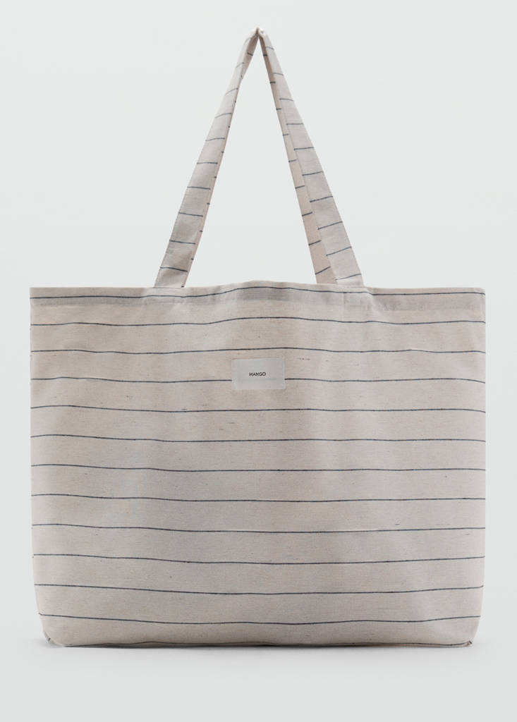 Tamaño grande. Tejido mezcla de algodón. 100% materiales reciclados. Estilo shopper. Estampado de rayas. Bolsa interior. Sin cierre