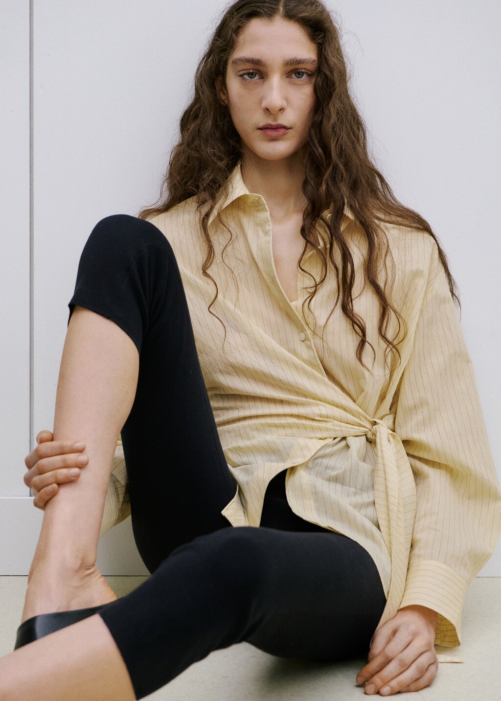 Tejido de algodón. Diseño recto. Diseño largo. Estampado de rayas. Cuello camisero. Detalle de nudo en la cintura. Manga larga abotonada con puños a contraste. Cierre delantero con botones.