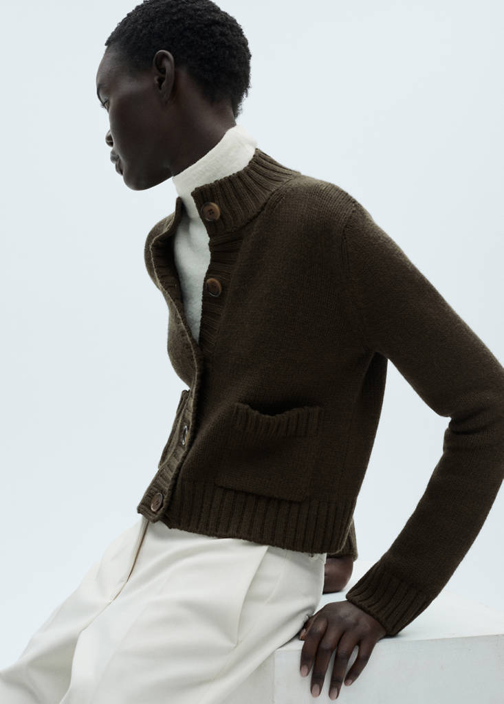 Tejido de punto. Diseño recto. Cuello perkins. Manga larga. Terminaciones en canalé. Dos bolsillos de parche en la parte delantera. Cierre de botones en la parte delantera