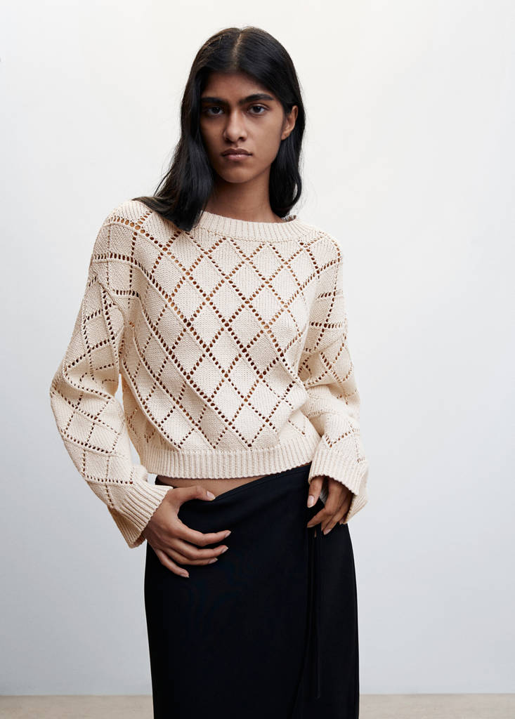 Tejido de punto grueso. Tejido mezcla de algodón. Textura de rombos. Diseño calado. Diseño recto. Cuello redondo. Manga larga. Terminaciones de canalé. Disponible Plus