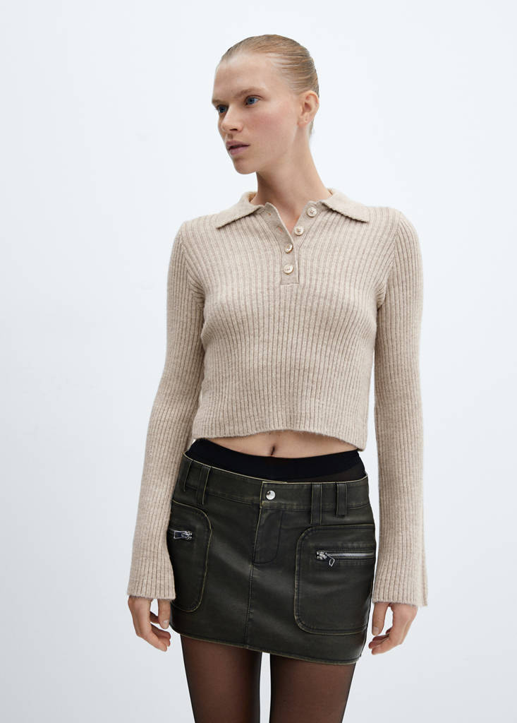 Tejido de punto, diseño recto, diseño canalé, cuello polo con cierre de botones, manga larga acampanada.