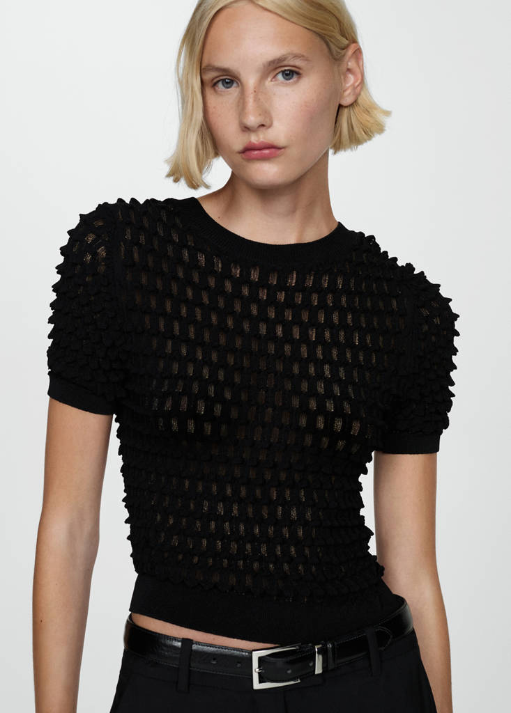 Jersey textura manga cortaPrecio actual [US$ 69,99 ]US$ 69,99Selecciona un colorNegroLa modelo lleva la talla S y mide 179cm.Selecciona tu tallaSMLMedidasAñadir a FavoritosVer lookEnvío gratis a tiendaTejido de punto fino. Tejido con textura. Cuello redondo. Manga corta. Diseño entalladoDetalles, composición y cuidadosDisponibilidad en tienda