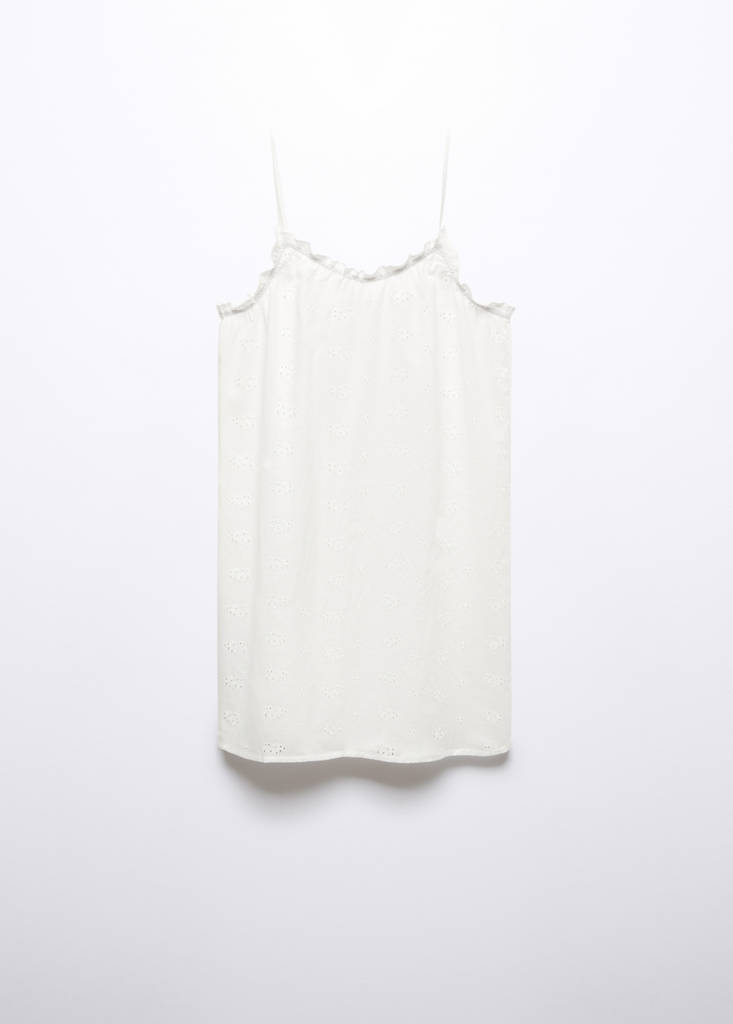 Diseño recto. Diseño corto. Cuello pico. Tirantes finos. Microflores bordadas. Sin cierre. Tejido 100% algodón