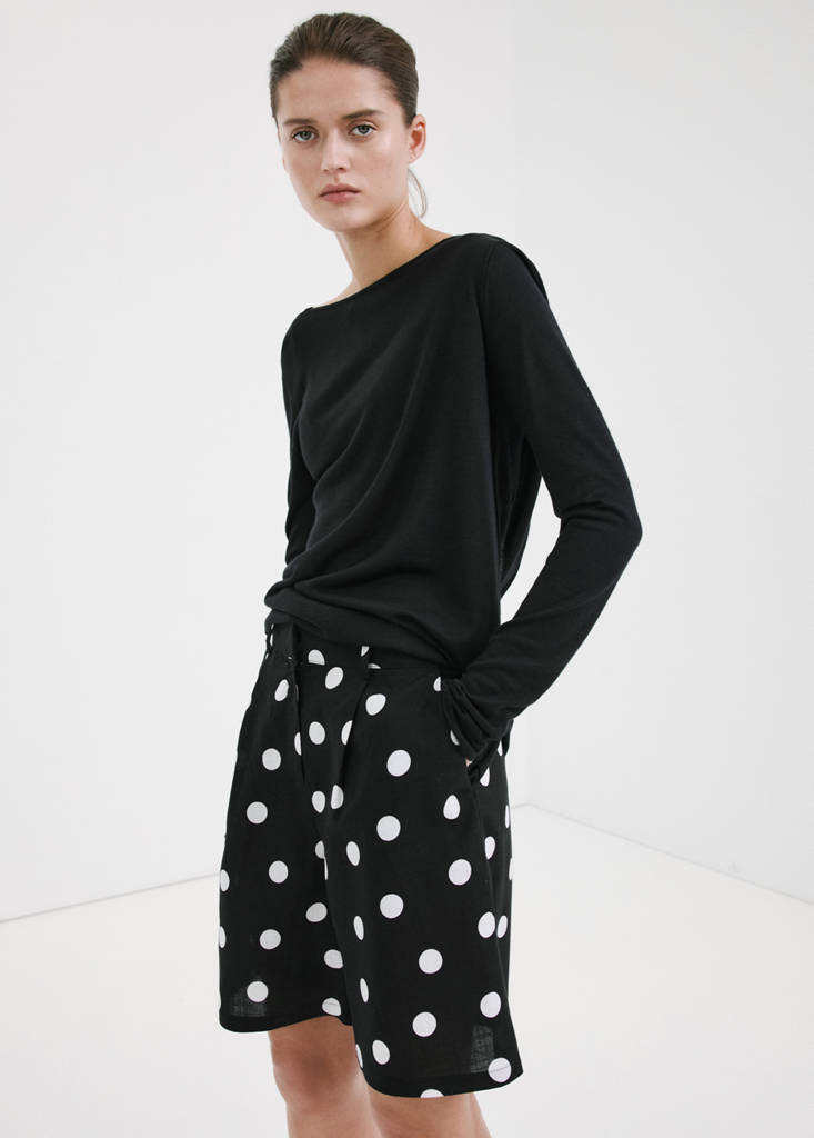 Tejido mezcla de lino y lyocell. Diseño recto. Diseño corto. Estampado de lunares. Dos bolsillos laterales. Cierre delantero de botón, gancho y cremallera ocultos con tapeta. Forro interior. Total look.