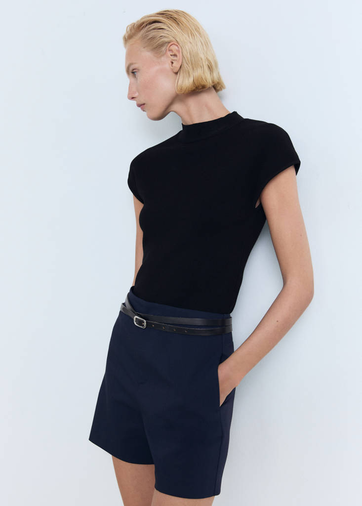 Tejido mezcla de algodón. Diseño recto. Diseño corto. Tiro alto. Dos bolsillos laterales. Cierre oculto de botón, gancho y cremallera. Looks de oficina. Dos bolsillos de ribete laterales. Dos bolsillos de ribete en la parte posterior. Cierre de cremallera y gancho. Forro interior.