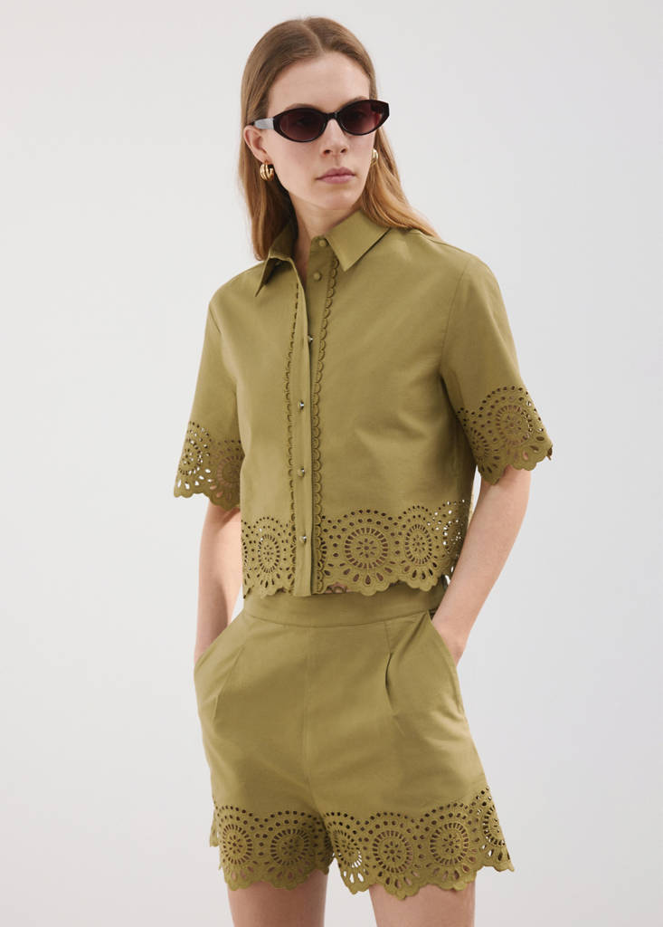 Tejido 100% algodón. Diseño corto. Detalles bordados calados. Detalle de pinzas. Tiro medio. Dos bolsillos laterales. Cierre de cremallera lateral.