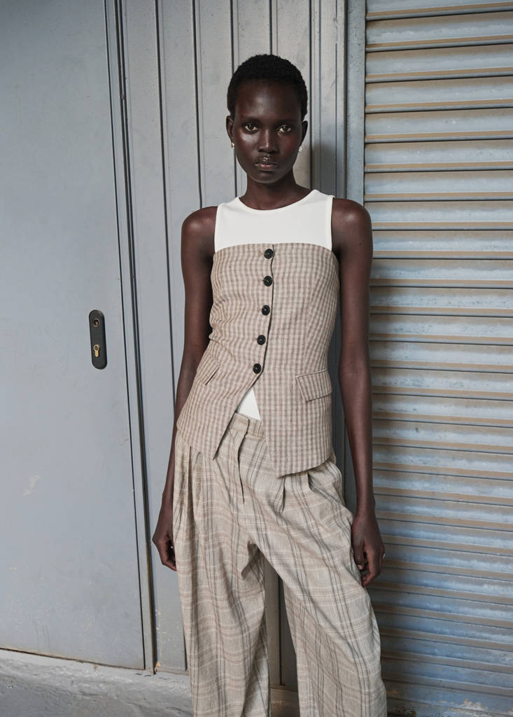 Diseño entallado. Estampado Cuadros. Escote palabra de honor. Sin mangas. Dos bolsillos de solapa laterales. Cierre delantero con botones. Total look.