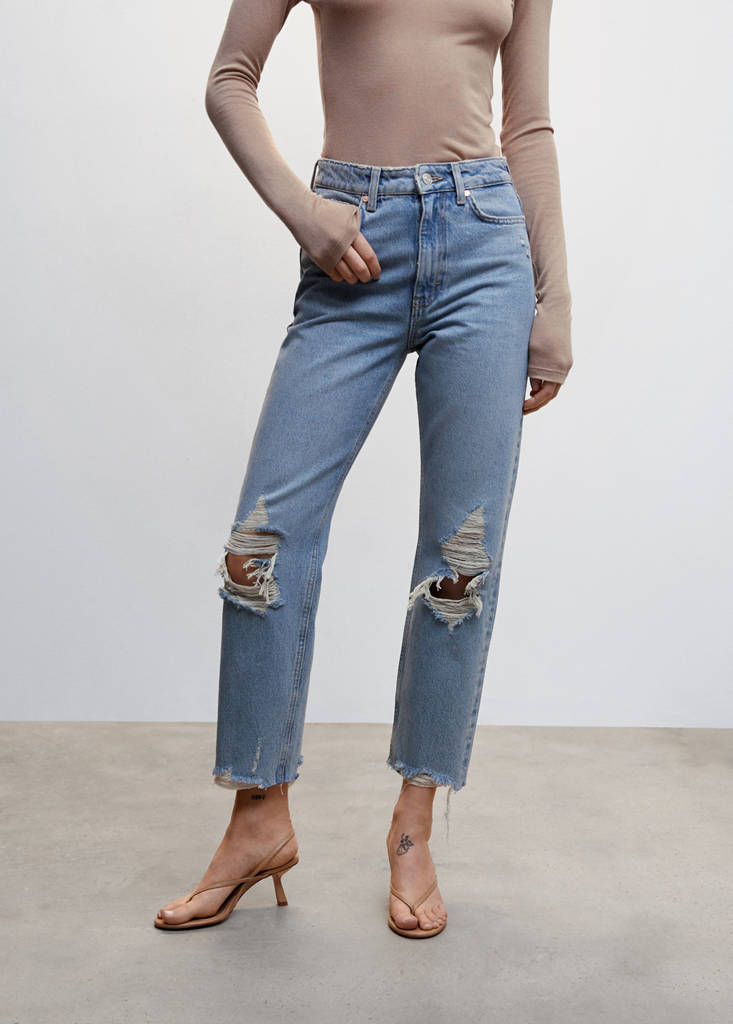 Tejido de algodón estilo tejano vaquero. Diseño recto. Diseño crop. Tiro alto. Detalle rotos decorativos. Trabillas. Cinco bolsillos. Cierre de cremallera y botón. Largo interior 68 cm. Disponible Plus. Festival Season