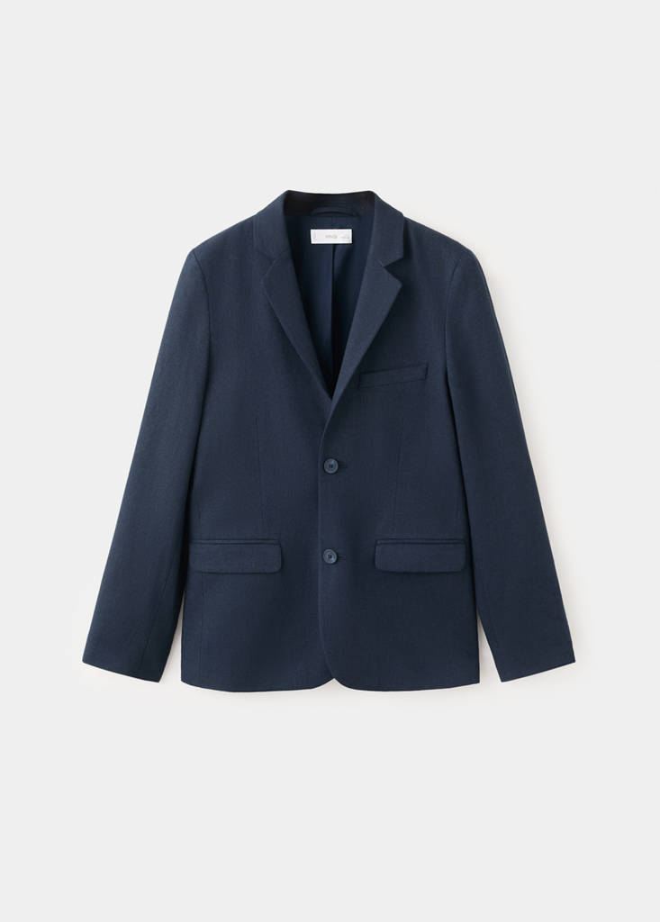 Tejido mezcla de lino y algodón. Diseño recto. Cuello pico con solapa. Dos bolsillos de ribete en la parte delantera. Puños con botones funcionales. Cierre delantero con botones. Colección fiesta, ceremonia y comunión.