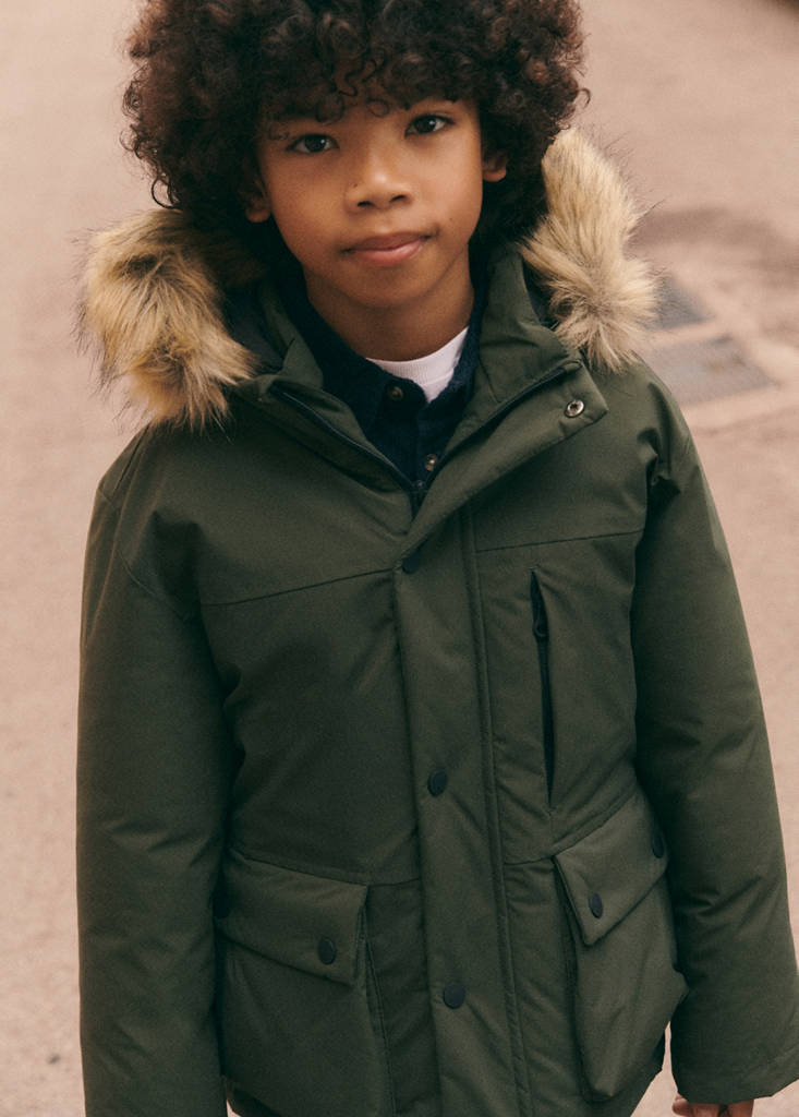 Capucha con detalle de pelo sintético. Forro interior. Tres bolsillos en la parte delantera. Etiqueta para datos personales. Cierre de cremallera y botones. Forro interior
