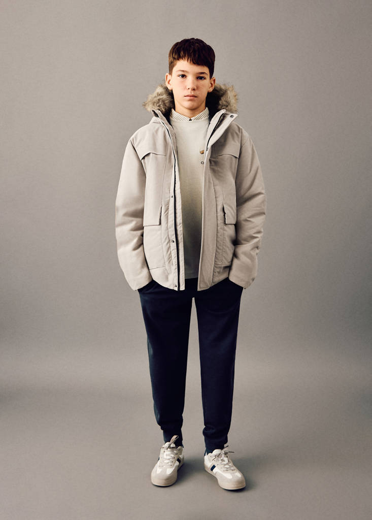 Diseño recto. Capucha con detalle de pelo sintético. Dos bolsillos delanteros. Cierre de cremallera y botón.