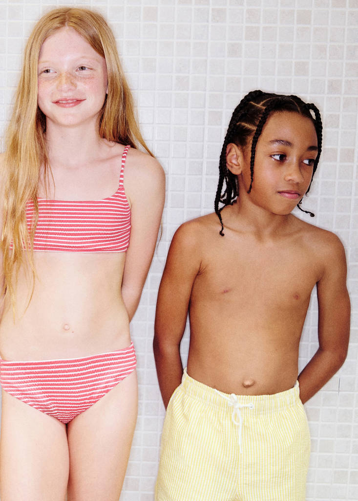 Tejido seersucker. Tejido mezcla de algodón. Diseño recto. Diseño de rayas. Cintura elástica con cordón ajustable. Dos bolsillos laterales. Colección baño.