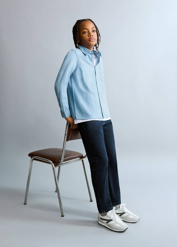 Tejido de algodón. Diseño largo. Diseño recto. Diseño liso. Trabillas para cinturón. Cierre de cremallera y botón. Vuelta en el bajo. Bolsillos laterales.