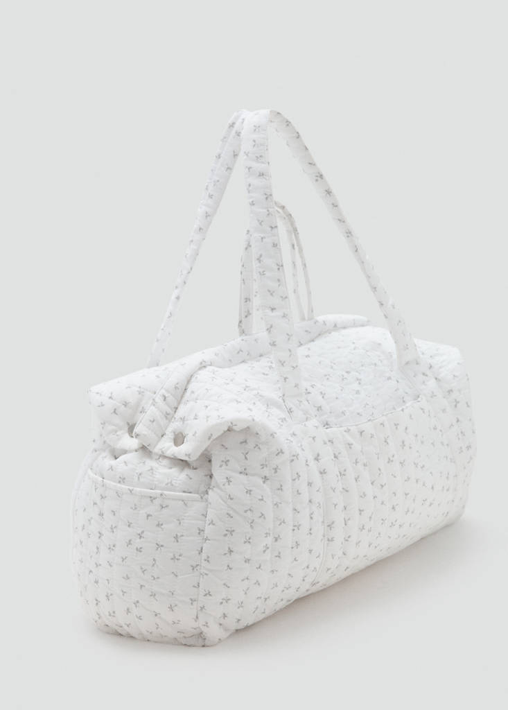 Tejido 100% algodón. Diseño acolchado. Estampado floral. Tamaño grande. Dos asas cortas. Dos asas largas. Cierre de botón y cremallera. Combínalo con el neceser de la colección. Maternity Collection. Welcome collection.