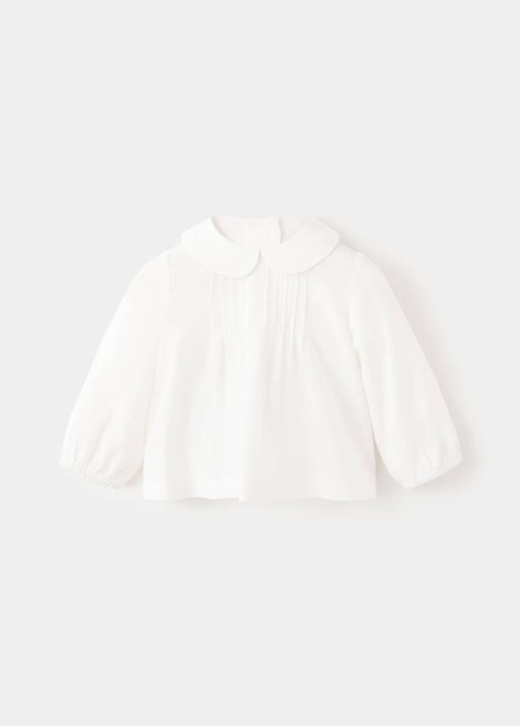 Tejido 100% algodón. Diseño recto. Cuello bebé. Manga larga con puños elásticos y fruncidos. Cierre de botones en la parte posterior. Detalles plisados. Nueva talla: 0 - 1 meses.