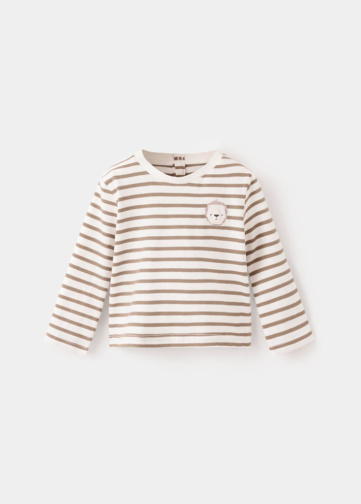 Confeccionada en tejido 100% algodón, esta prenda presenta un diseño recto con rayas y manga larga. Destaca el león bordado en la parte delantera, añadiendo un toque distintivo