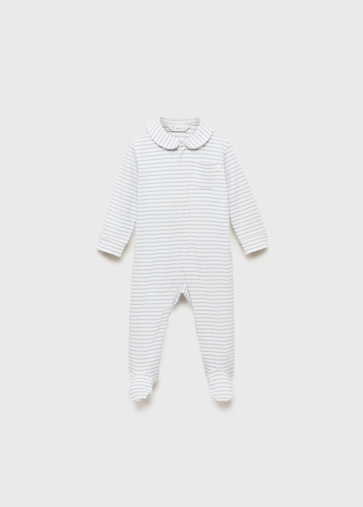Tejido de algodón. Diseño largo. Diseño de rayas. Cuello bebé. Manga larga. Con patucos. Cierre de botones a presión.