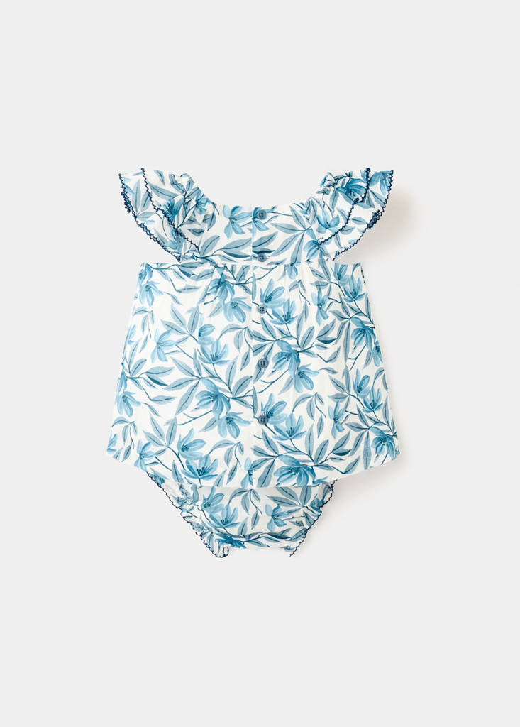 Tejido 100% algodón. Diseño estampado floral. Cuello recto. Tirantes anchos. Volantes en las mangas. Detalles bordados. Ranita algodón estampada. Cintura elástica. Terminaciones con volantes.