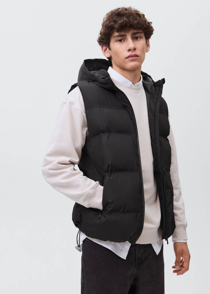 Chaleco acolchado capuchaPrecio actual [US$ 55,99 ]US$ 55,99Selecciona un colorNegroSelecciona tu tallaXXSXSSMLXLGuía de tallasAñadir a FavoritosVer lookEnvío gratis a tiendaVer disponibilidad en tiendaDescripciónTejido acolchado. Diseño recto. Con capucha. Sin mangas. Cierre delantero con cremallera. Dos bolsillos laterales.Ver detallesCompartir