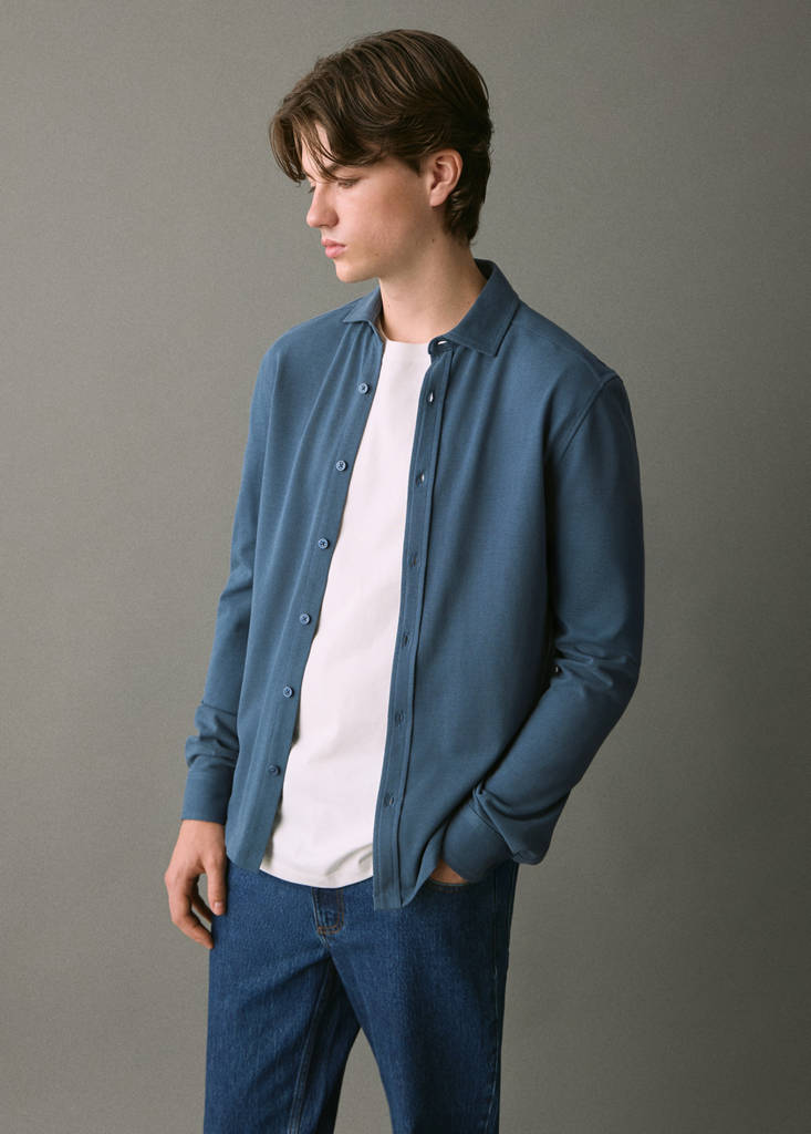 Tejido 100% algodón. Diseño recto. Cuello polo. Cierre delantero con botones. Manga larga con puños abotonados. Detalle de abertura lateral en el bajo.