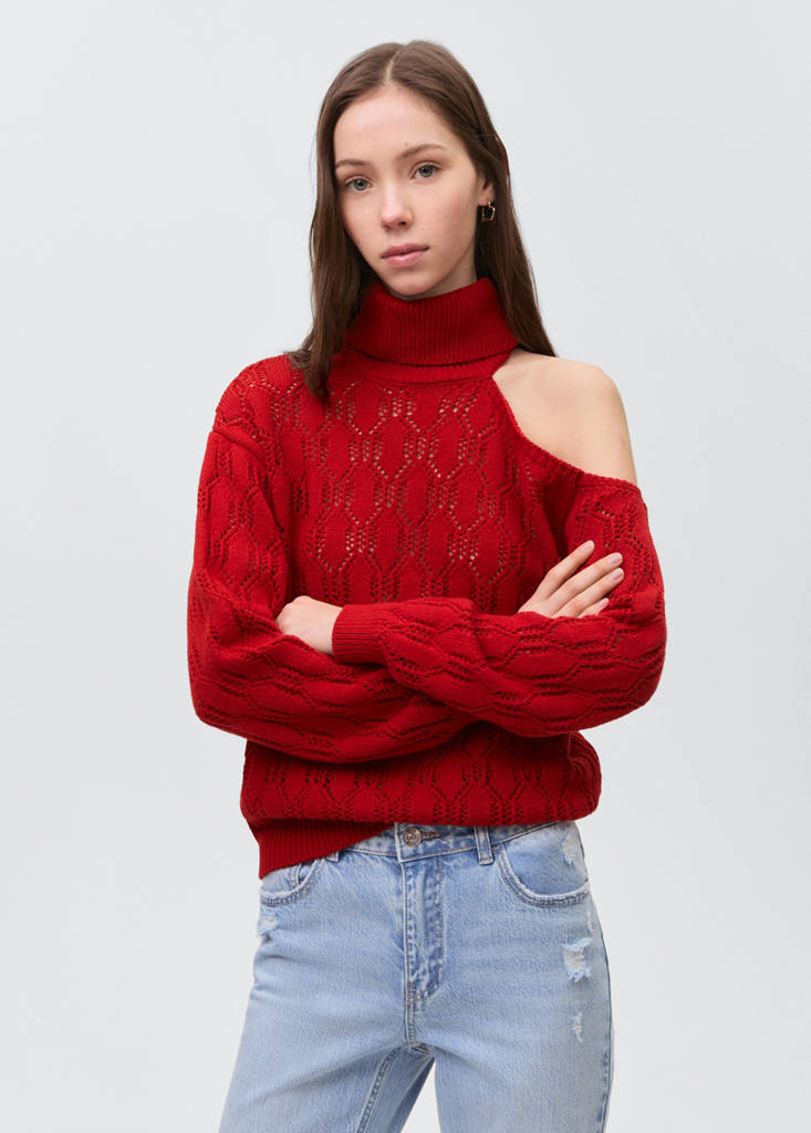 Tejido de algodón. Tejido de punto calado. Cuello alto. Cut-out. Hombro descubierto. Manga larga. Puños y bajo en rib