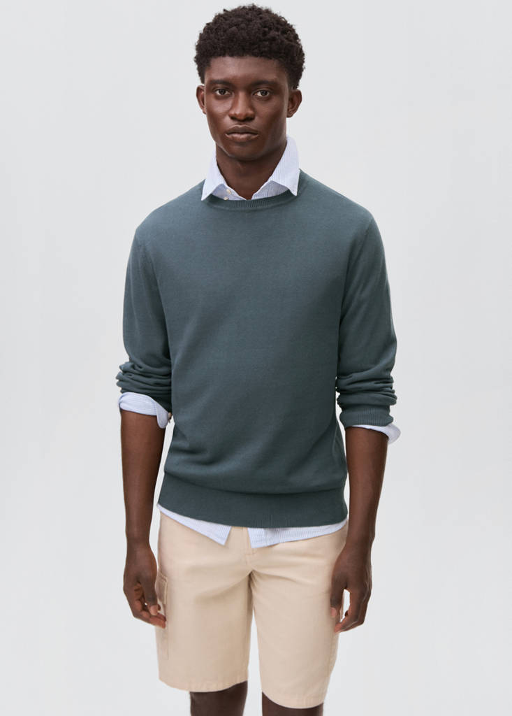 Jersey punto algodónPrecio actual [US$ 45,99 ]US$ 45,99Selecciona un colorAzul petróleoTallaje pequeño - Elige una talla más de la habitualSelecciona tu tallaXXSXSSMLXLAñadir a FavoritosVer lookEnvío gratis a tiendaVer disponibilidad en tiendaDescripciónTejido 100% algodón. Tejido de punto. Diseño recto. Diseño liso. Cuello redondo. Manga larga. Cuello, puños y bajo en canalé.Ver detallesCualidades del artículoAlgodón recicladoAl menos 20%Esta fibra se obtiene a partir de restos textiles pre y post consumo que se transforman en nuevos tejidos.Compartir