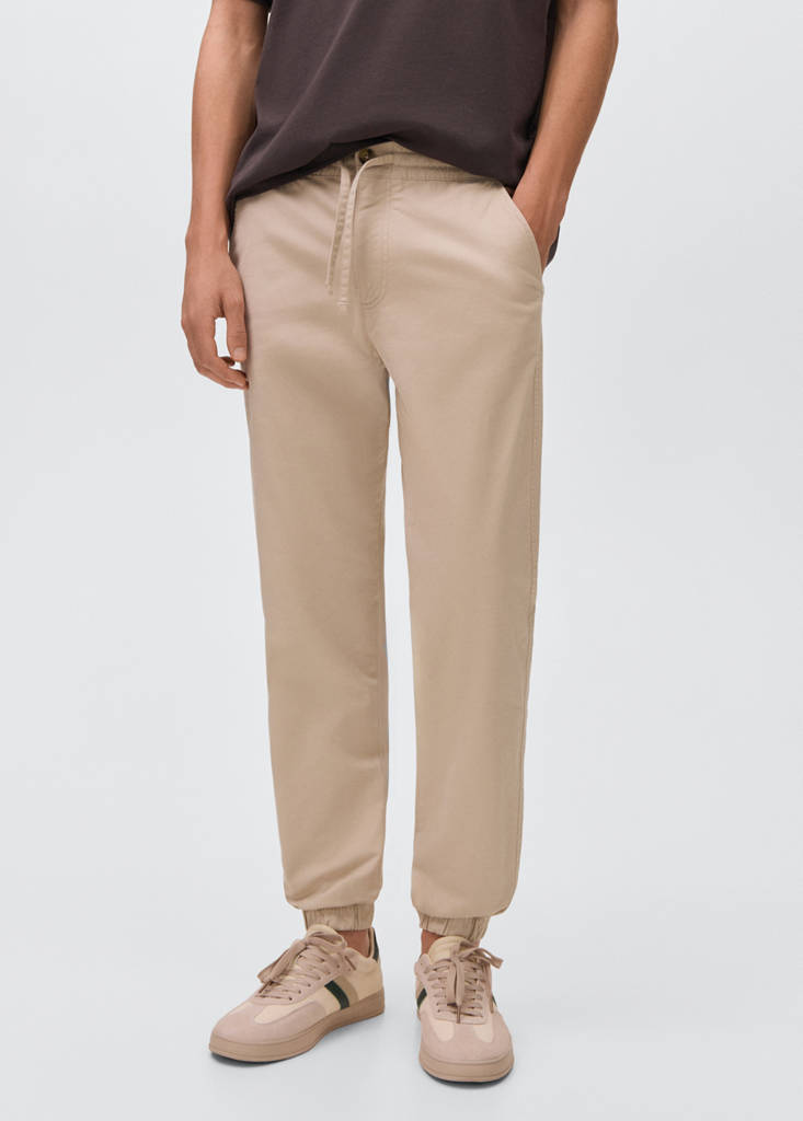 Tejido de algodón. Tejido elástico. Diseño largo. Diseño recto. Cintura elástica con cordón. Cierre de botón. Dos bolsillos laterales. Dos bolsillos de ribete en la parte posterior. Bajo con goma elástica.