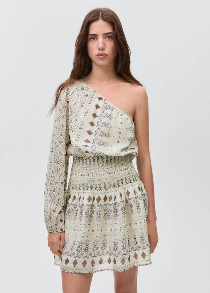 Diseño asimétrico. Diseño estampado. Diseño corto. Cintura elástica tipo nido de abeja. Manga larga. Puños fruncidos