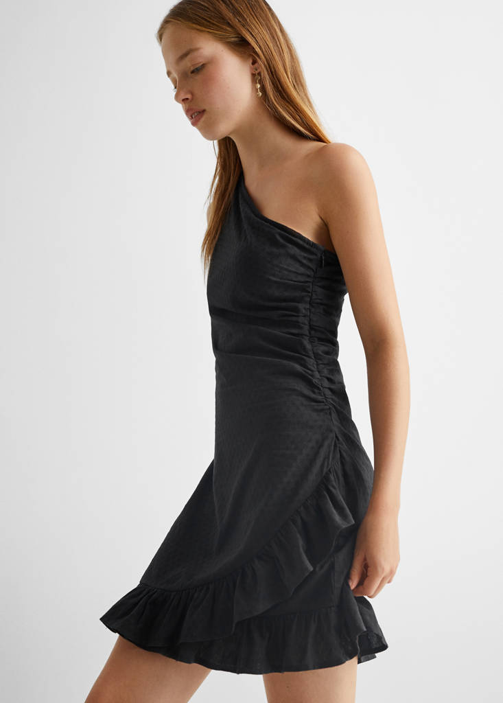 Tejido de algodón. Diseño asimétrico. Diseño volantes. Diseño corto. Sin mangas. Cierre lateral. Cierre lateral de cremallera