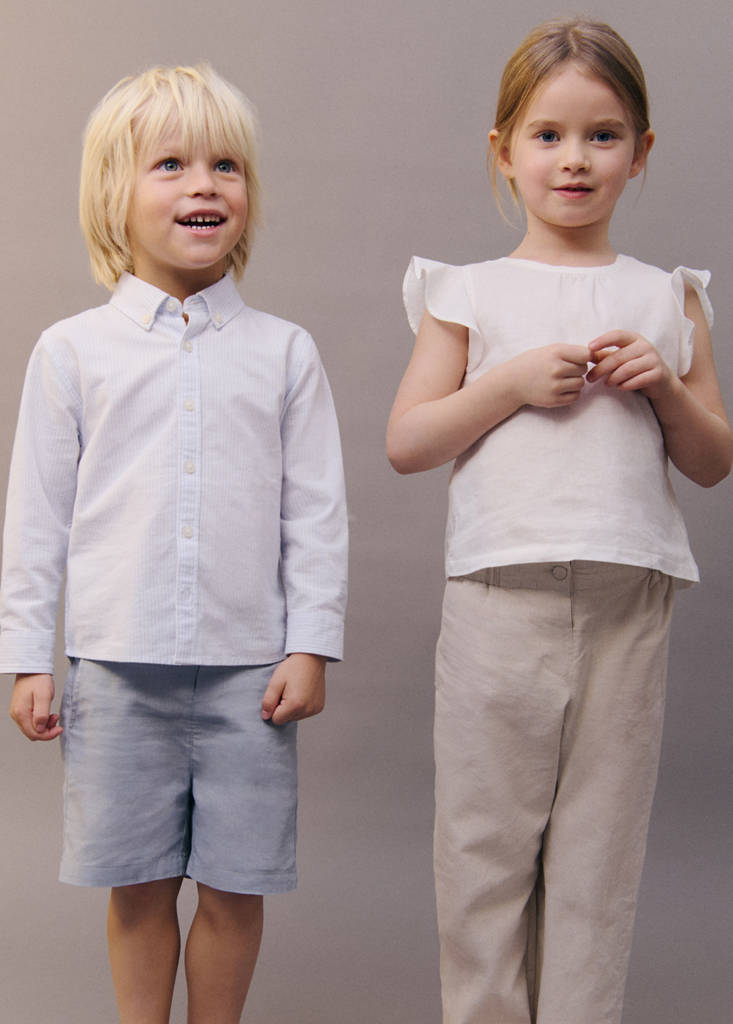 Cotton and linen blend fabric. Gathered detail. V-neck. Short-sleeved ruffle. Button fastening on the back section. Party, ceremony and communion collection