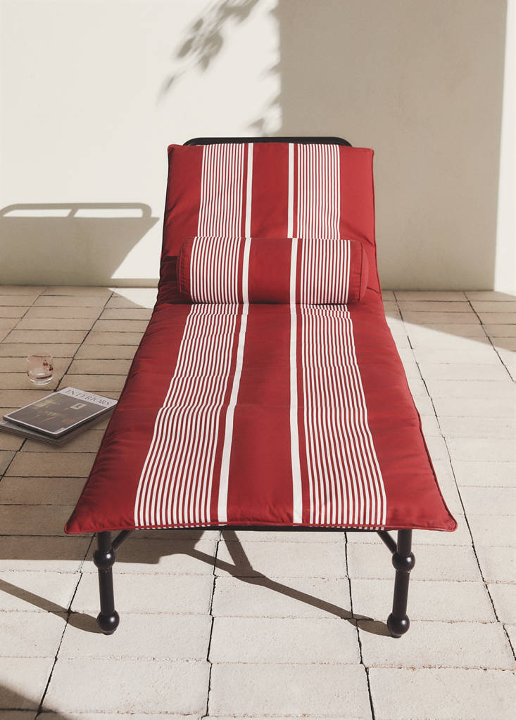 100% Cotton. Size: 70x200cm. Removable outdoor lounger cushion. Striped design. Water Repellent: Technical water-repellent fabric. Includes filling. Combine with matching cushions
