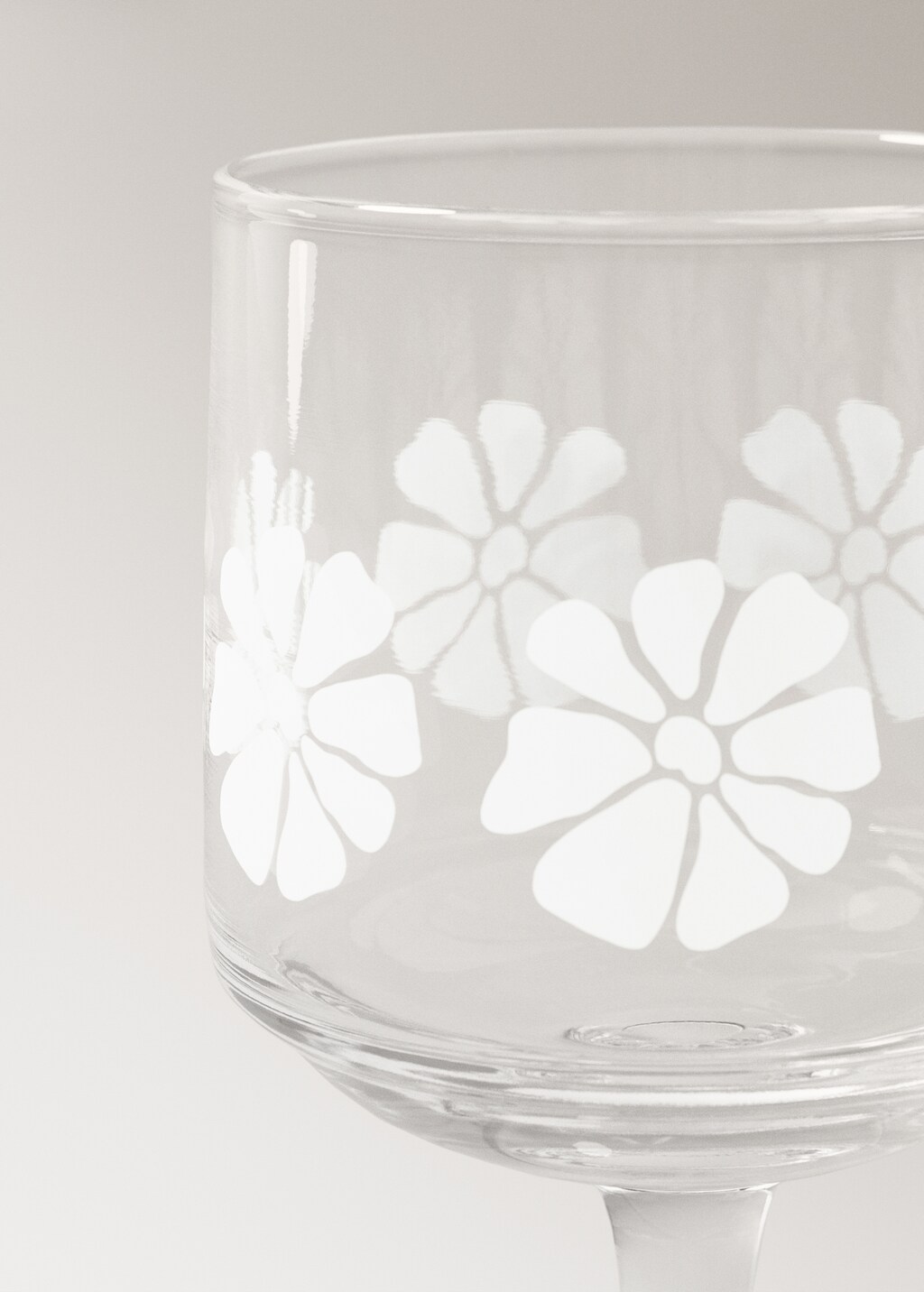 100% glass. Size: 7,6cm. Height: 12cm. Glass cup decorated with a flower. Floral design detail, ideal for adding an original, pleasant and elegant touch to your tableware. Coordinates with more products from the collection.