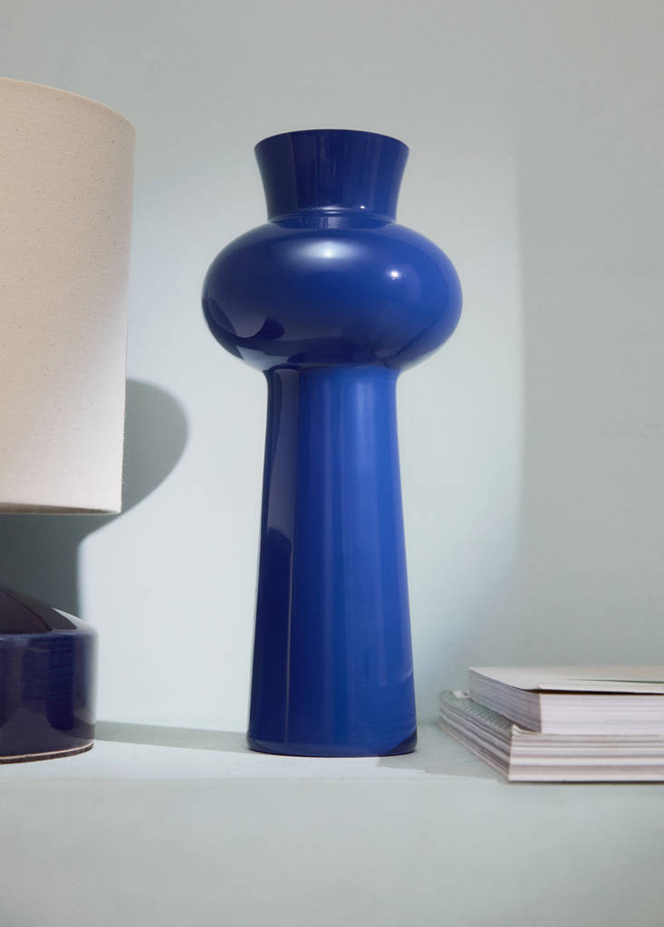 Tall glass vaseCurrent price [€ 19,99 ]€ 19,99Select a colourBlueSelect your sizeSMSizeChoose your sizeAddAdd to your wishlistSee lookFree delivery to store100% glass. Diameter: 12 cm. Height: 28 cm. Glass vase with an elongated design and a rounded detail at the top. Available in more sizesDetails, composition and careStore availability