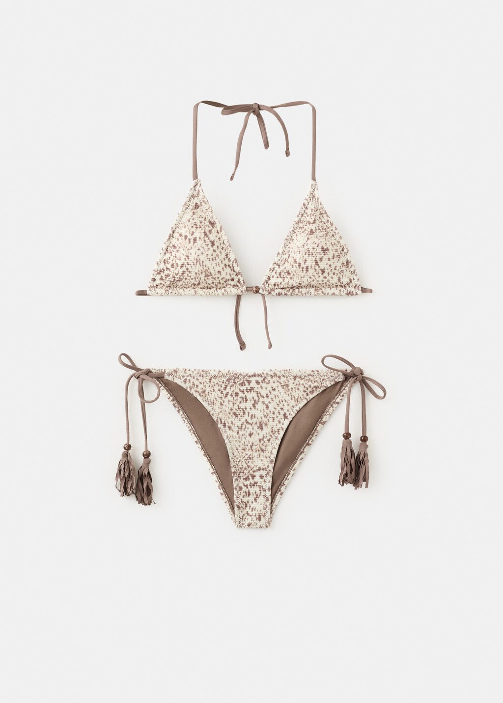 Bikini set. Stretch fabric. Triangular design. Thin straps. Printed design. Tie fastening. Mid-rise briefs.