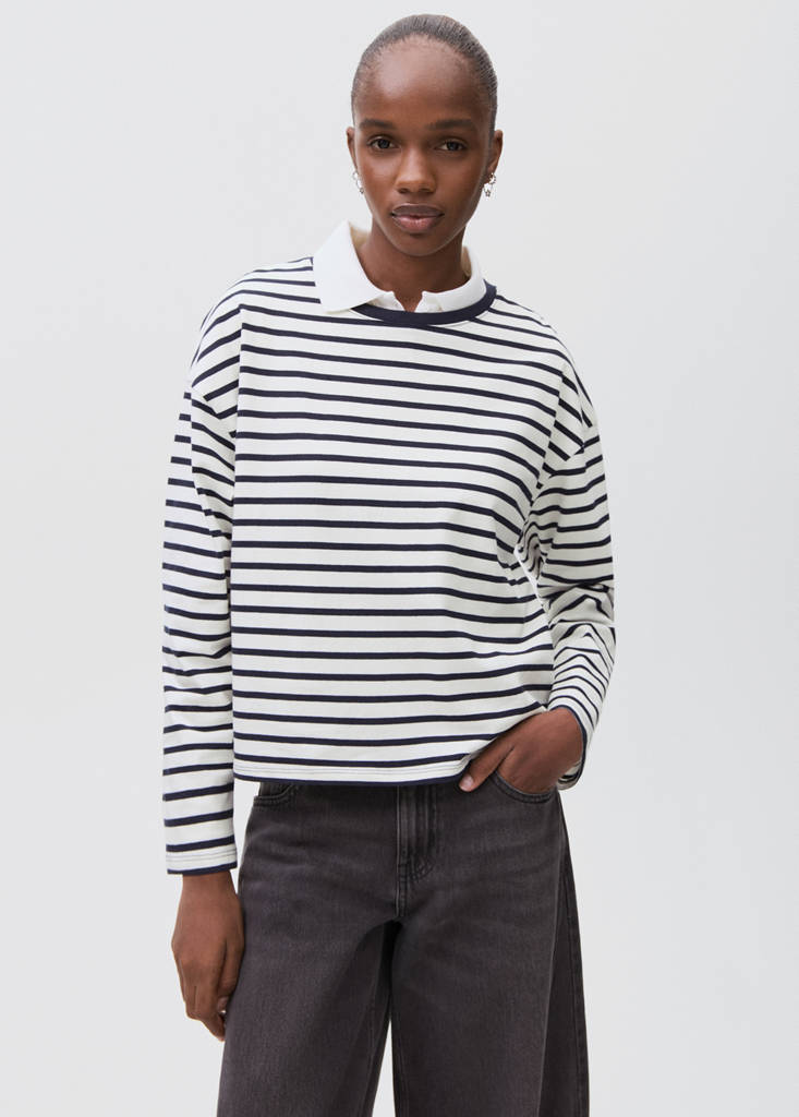 Crafted from 100% cotton fabric, this garment features a straight design with stripes. The contrasting round neck gives it a distinctive air, while the long sleeves complete its style