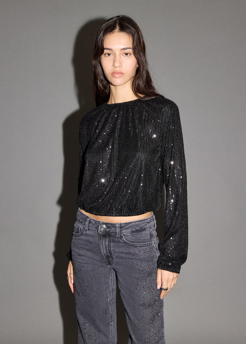 Sequin fabric. Straight Design. Round neck with button closure. Long sleeves with ribbed trims. Ruched detail at the neck. Party collection. Party Collection. Christmas Collection. Glossy design.
