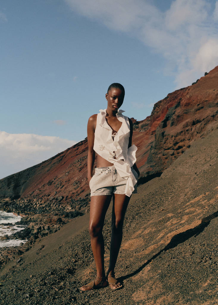 100% cotton fabric. V-neckline. Sleeveless. Bow detail on the neckline. Ruffle detail