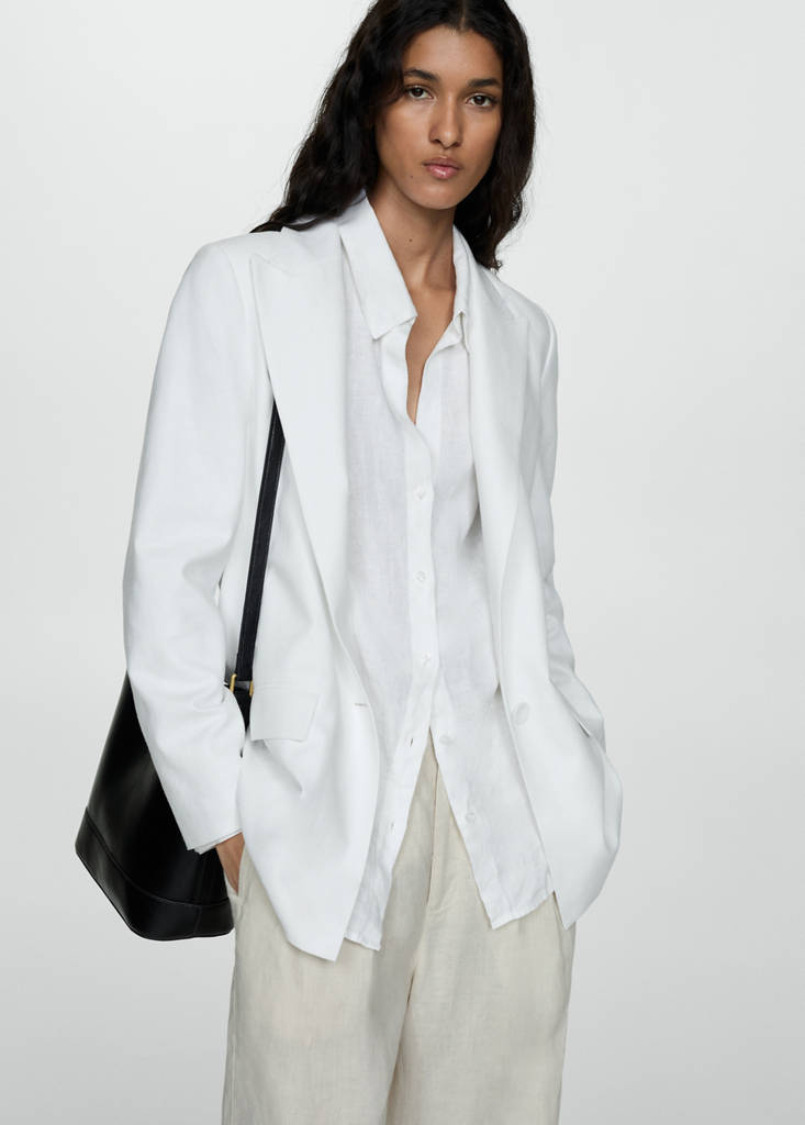 Linen mix. Straight design. Lapel-collar V-neck collar. Lapel with notch. Long sleeves. Two front flap pockets. Front button closure. Inner lining