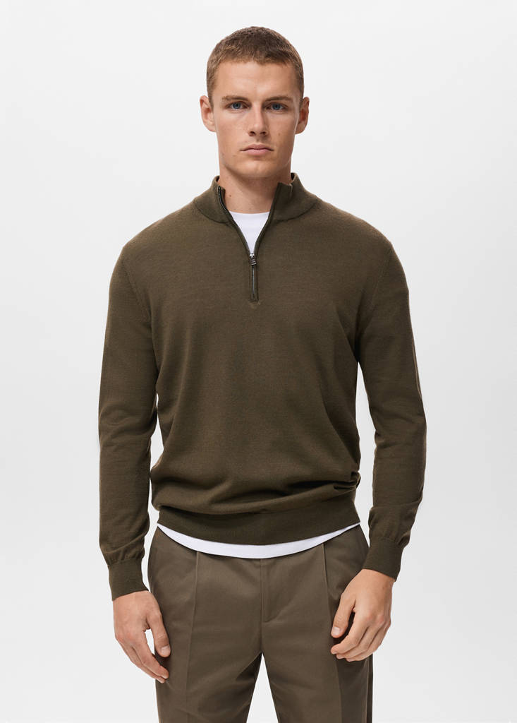 قَصّة عادية. 100% من صوف ميرينو. نسيج محبوك ناعم. طوق بيركنز مع سحاب للاغلاق. ياقة مضلعة وكمان وحاشية سفلية