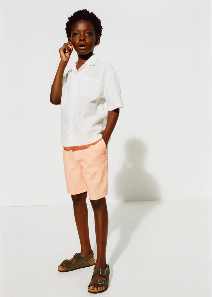 نسيج مزيج من القطن والكتان. تصميم مستقيم. تصميم قصير. خصر مطاطي. جيبان جانبيان. جيبان خلفيان بحافة. إغلاق بسحاب وزر