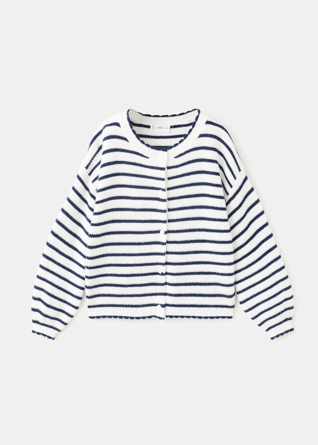 نسيج من القطن. نسيج محبوك ناعم. نسيج مخطط. ياقة مستديرة مموجة. أكمام طويلة. إغلاق بأزرار في الجزء الأمامي.