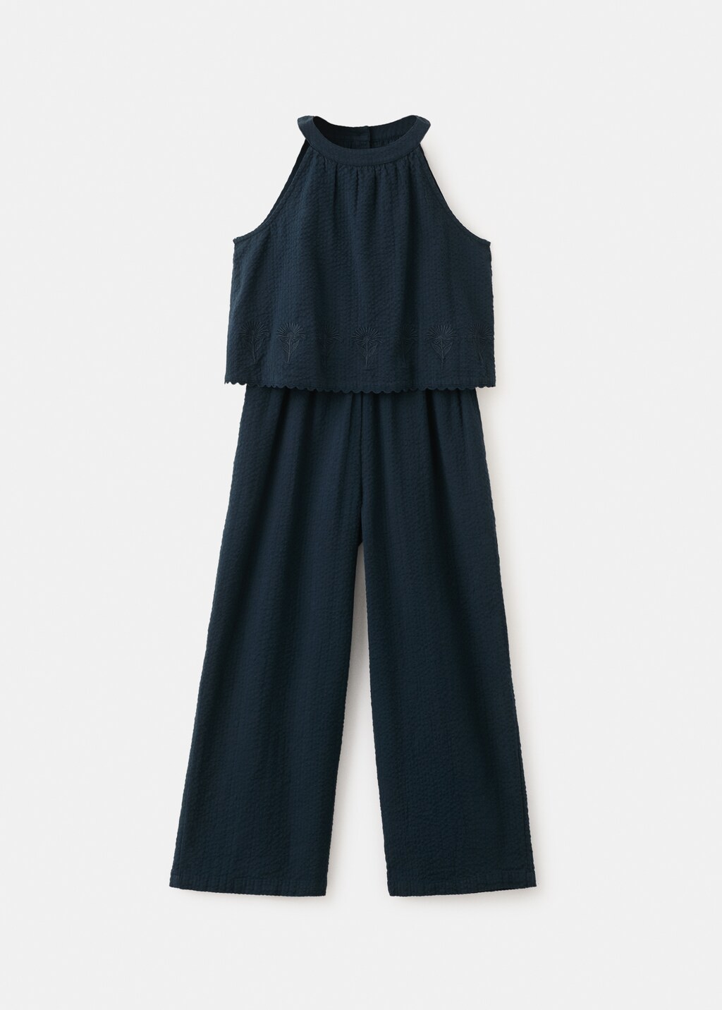 نسيج 100% قطن. تصميم طويل. ياقة هالتر. دون أكمام. خصر مجعد. إغلاق بزر في الجزء الخلفي.