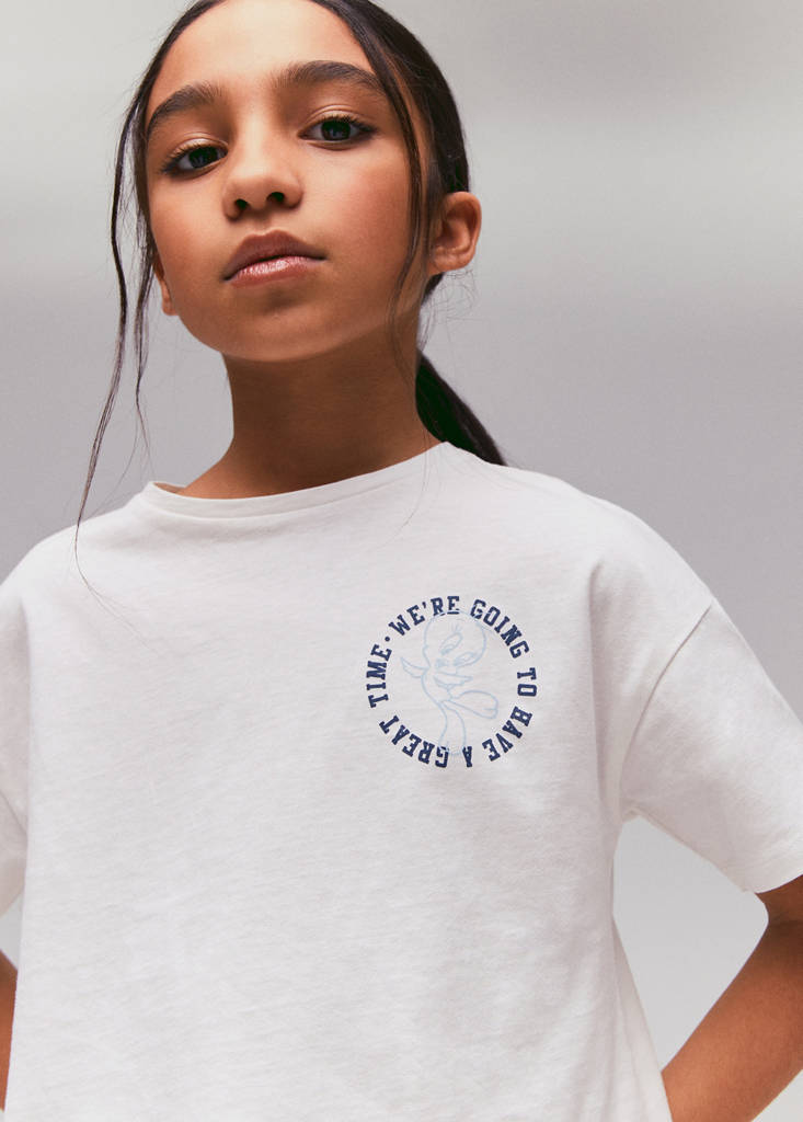 100% قطن. طباعة تويتي. تصميم مستقيم. رقبة مدورة. كم قصير