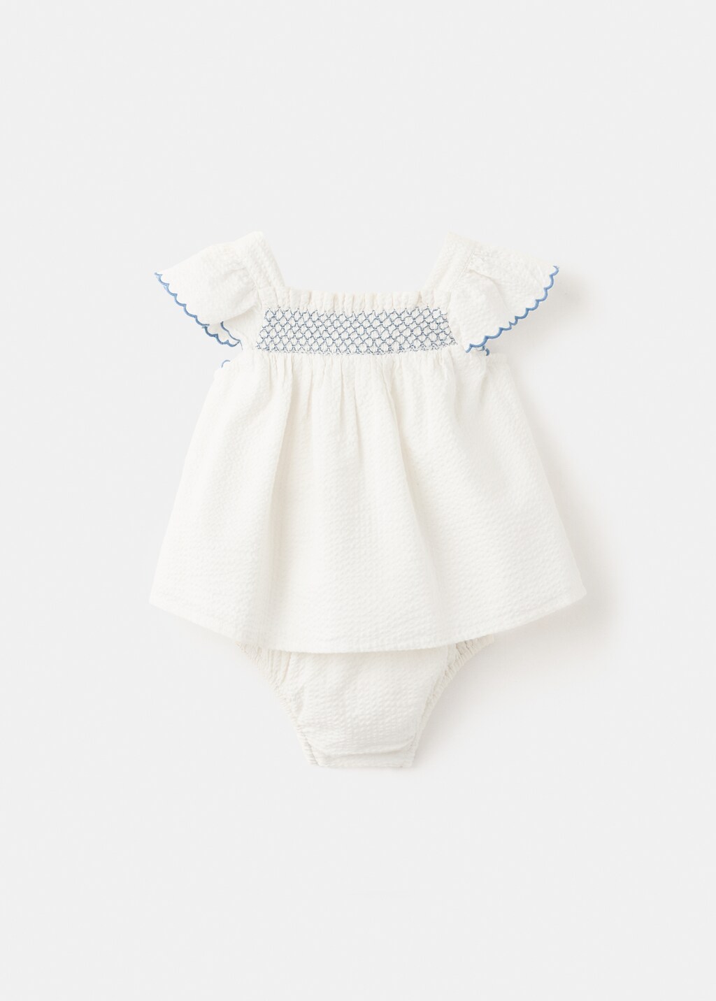 نسيج قطن. ياقة مستقيمة. أكمام قصيرة. تصميم زهري. خصر مطاطي. تفاصيل كشكش عند الخصر. تفاصيل مطرزة بتباين. نهايات مرنة.