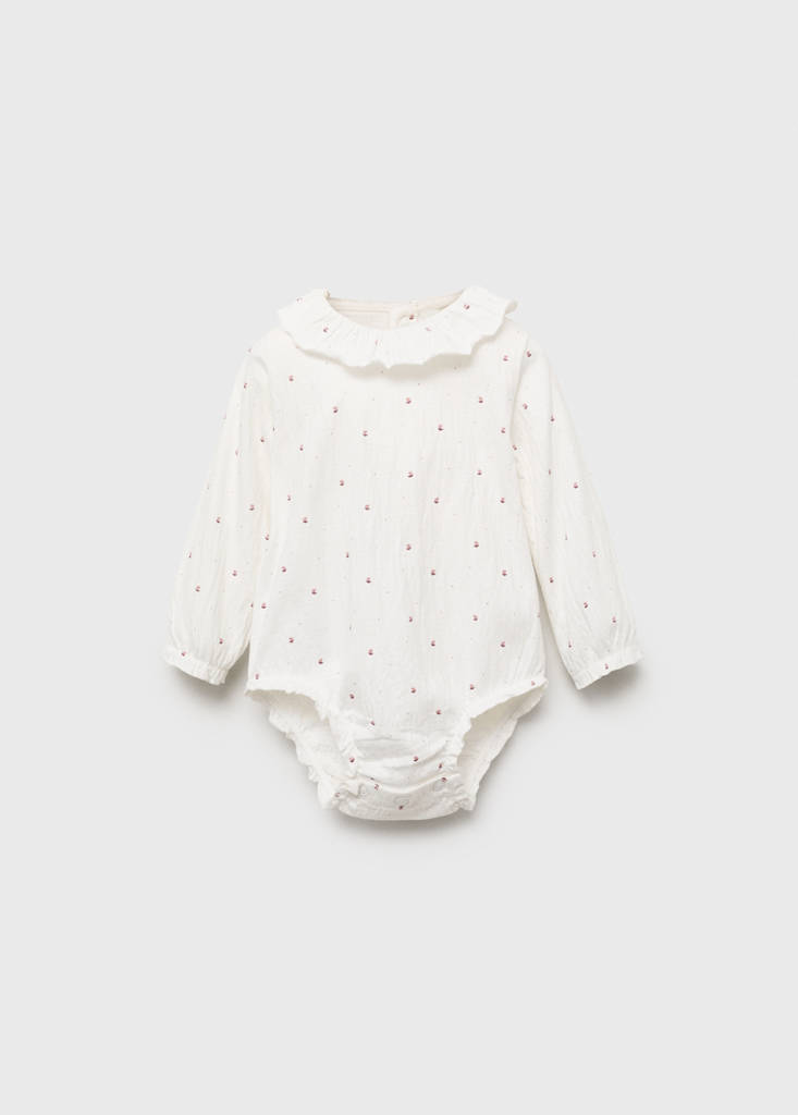 مصنوع من قماش مزيج القطن، يتميز هذا البودي بتصميم مطبوع مع ياقة بيبي وأكمام طويلة. يسهّل إغلاق الأزرار بالضغط استخدامه ويضمن الراحة.