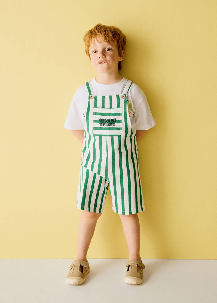 Denim-style cotton fabric. Short design. Straight design. Striped design. Straps with button closure. Front patch pocket. Text printed on the chest