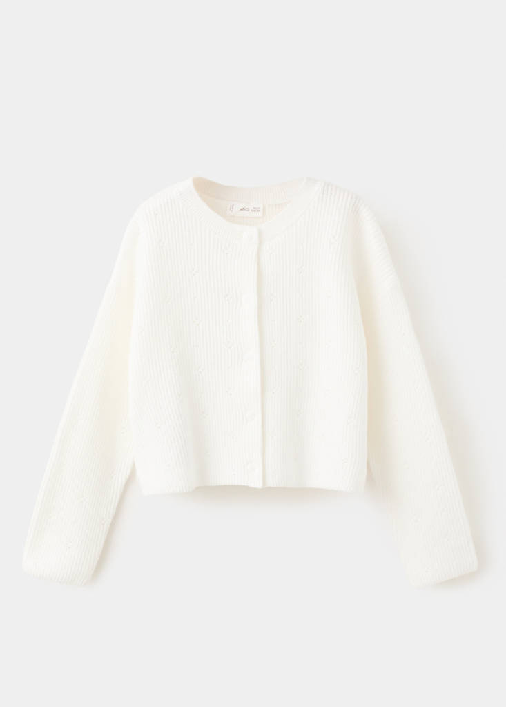 Openwork detail knit cardiganCurrent price [EGP 1,699.00 ]EGP 1,699.00Select a colourOff WhiteSelect your size12-18 months (86cm)18-24 months (92cm)2-3 years (98cm)3-4 years (104cm)4-5 years (110cm)5-6 years (116cm)DimensionsAddAdd to your wishlistSee lookFree delivery to storeCotton fabric. Open-knit fabric. Round neck. Long sleeves. Button fastening at the front. Valentine CollectionDetails, composition and careStore availabilityItem qualitiesRecycled cottonAt least 20%This fibre is obtained from pre- and post-consumer textile waste that is transformed into new fabrics.