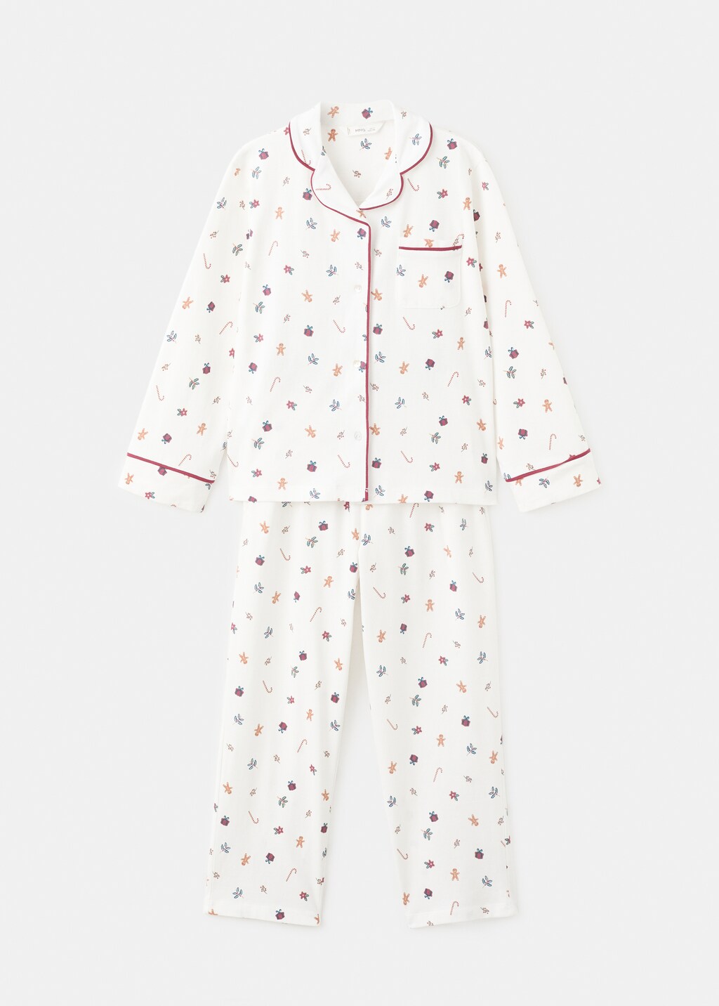 Long Sleeve. Long Length. Shirt collar with lapel. Christmas Collection. Cotton fabric. Two pieces. Long design. Printed design. Christmas print. Shirt Collar. Front closure with buttons. Front patch pocket. Elasticated waist.