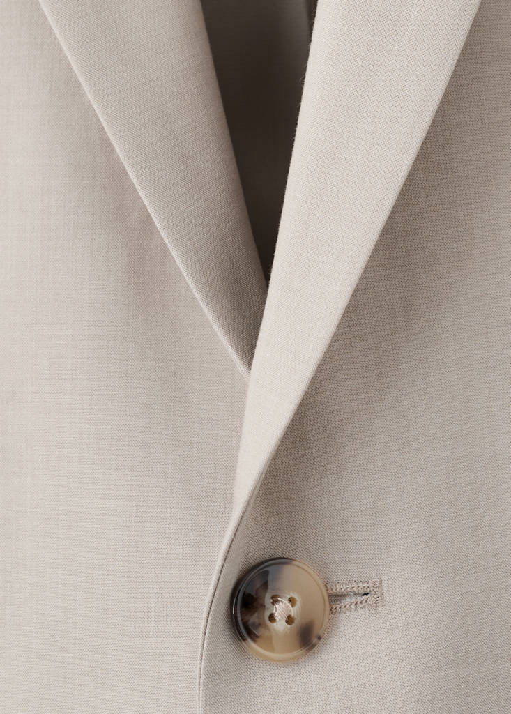 Super slim fit. Notch lapels and buttonhole. One welt pocket on the chest. Two front flap pockets. Buttoned strap cuffs. Interior pocket. Inner lining. Hem with two side slits. Front closure with buttons